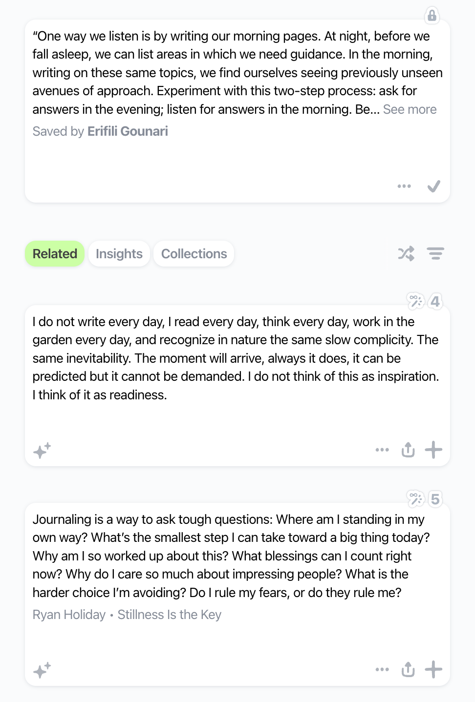 This is where Sublime comes into play, the tool that I and so many other writers and creators use to support our process. What I love the most about Sublime is that you use it not only to organize your sources, but also to find new sources and inspiration that you otherwise wouldn’t have discovered. This is my favorite thing: if I’m reading an article or book and I save an interesting quote into Sublime, then it gives me more related quotes saved by other users, on the same topic. I love how this enables me to go deeper into a rabbit hole of a topic I’m exploring in my writing, and to discover so many new sources, books, articles, and ideas.